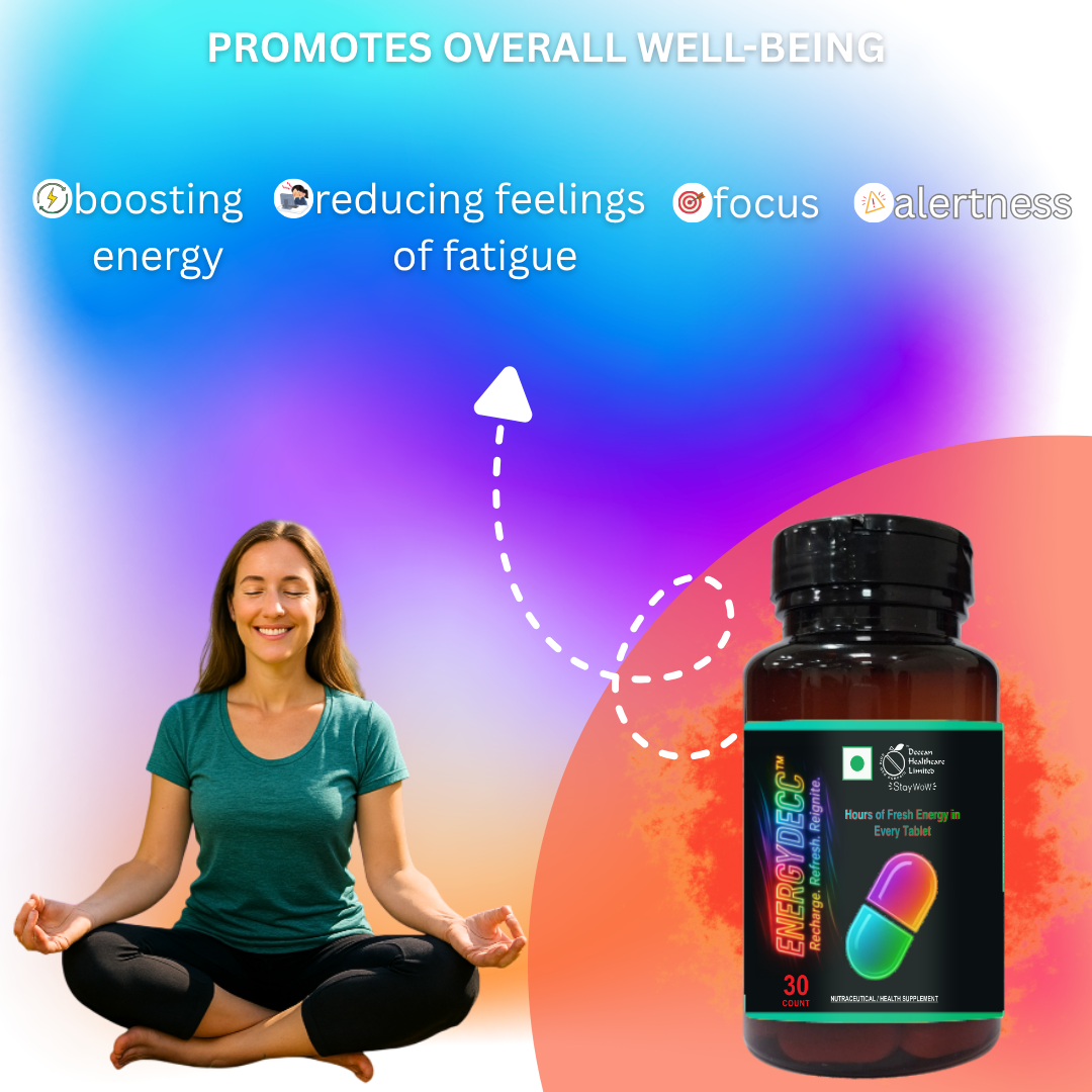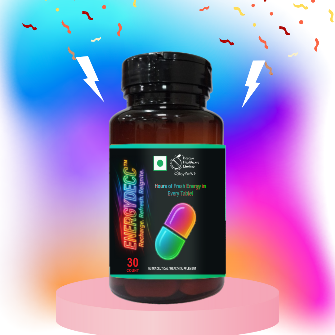 ENERGYDECC is a dietary supplement from Deccan Healthcare Limited that aims to provide "Hours of Fresh Energy in Every Tablet." The product is formulated to serve as a daily energy booster. Its key functions include boosting energy levels, reducing feelings of fatigue, and supporting mental focus and alertness. By addressing these areas, it also promotes an overall sense of well-being.