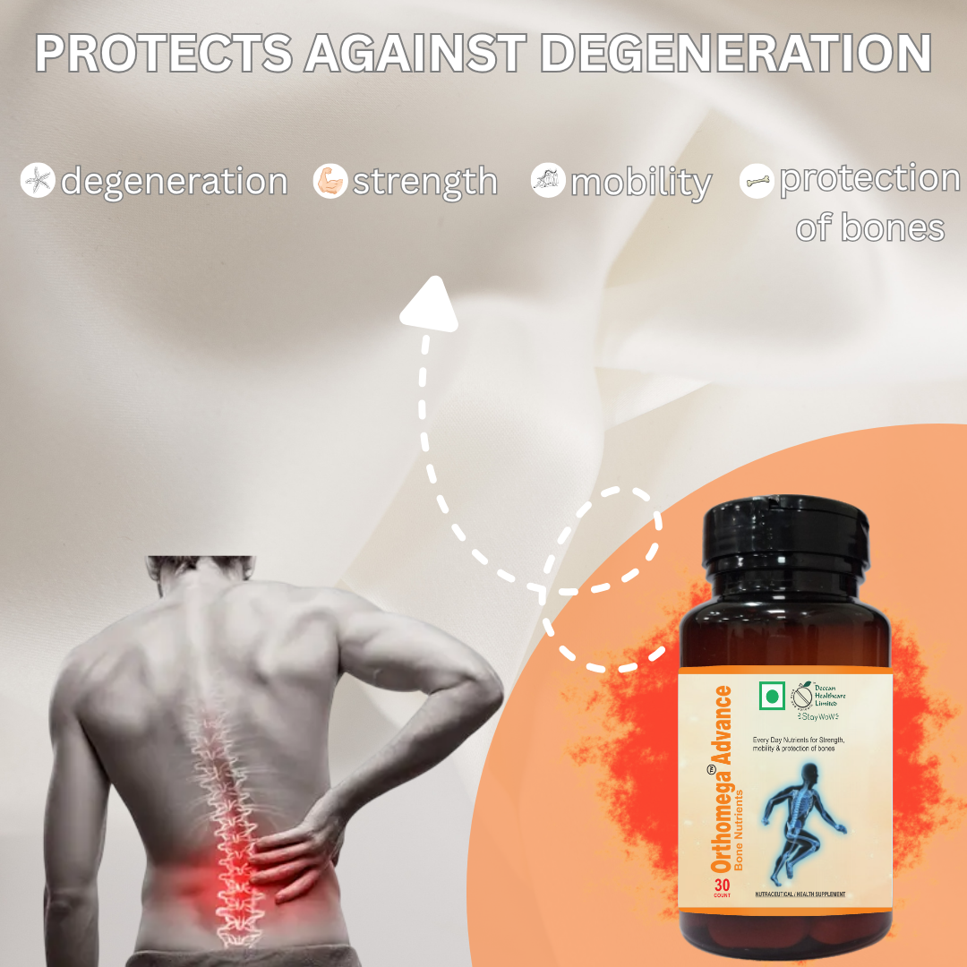 ORTHOMEGA ADVANCE is a bone health supplement from Deccan Healthcare Limited, formulated with 13 different ingredients. It is intended for daily use to support bone health by providing nutrients that help maintain bone density and strength. The product also aims to support collagen production and protect against bone-related degeneration. It is marketed as a solution for improving the overall strength, mobility, and protection of bones.